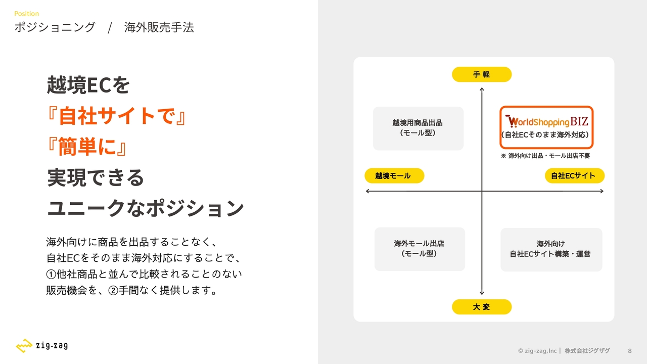 当社サービスのポジショニングです。スライド右側の図は、ECショップにおける海外販売手法をまとめたものです。横軸には販売ルートが越境モールであるか自社ECサイトであるかを、縦軸には運用の手軽さと大変さを示しています。