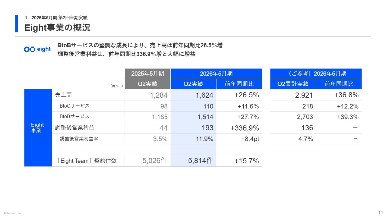 Eight事業についてご説明します。BtoCサービスの売上高は前年同期比11.6パーセント増と堅調に推移しました。BtoBサービスの売上高は、ビジネスイベントの堅調な成長や採用関連サービスの好調な成長等により、前年同期比27.7パーセント増となりました。