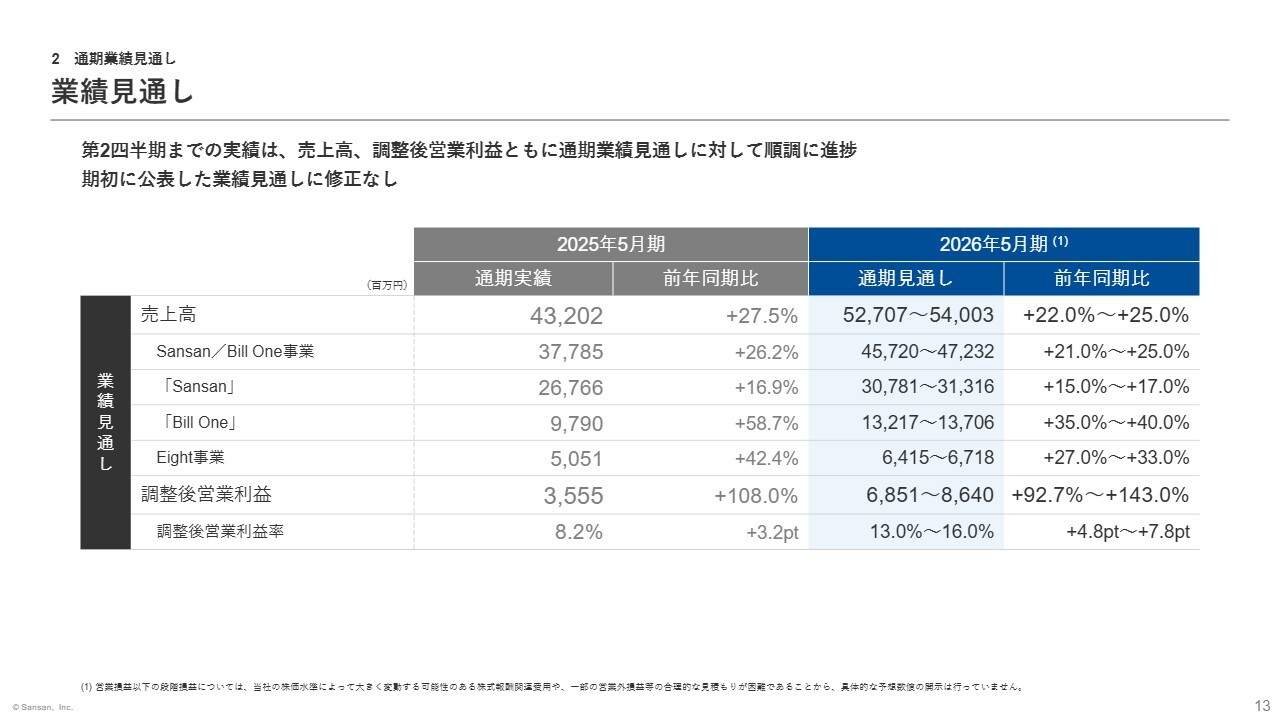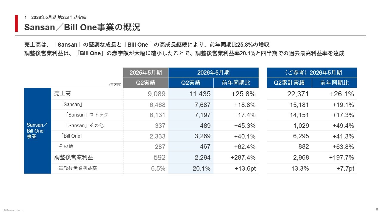 これにより、調整後営業利益は前年同期比287.4パーセントの大幅な増益となりました。サービス別では、「Sansan」が前年同期比27.5パーセント増となりました。また、「Bill One」は約2億9,800万円の赤字にとどまり、前年同期と比べて約13億円改善しました。