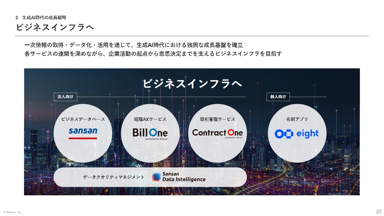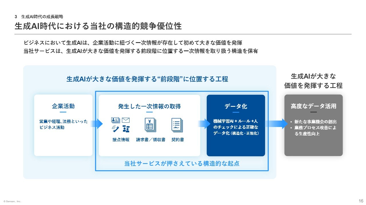 このように、「Sansan」は企業内に蓄積された営業の文脈を生成AIが扱えるビジネスデータへと進化させていきます。そして、これらは生成AI時代における重要な成長ドライバーになると捉えています。