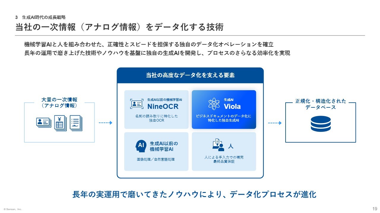 実際、独自生成AI「Viola」の開発に成功しており、直近のデータ化コスト削減に大きなインパクトをもたらせています。今後も長年培った技術やノウハウを基に、データ技術の進化を実現していきます。