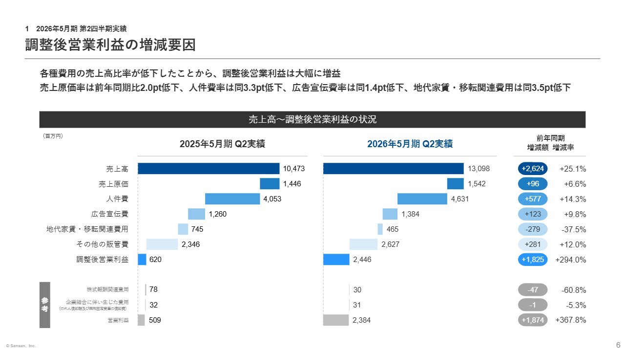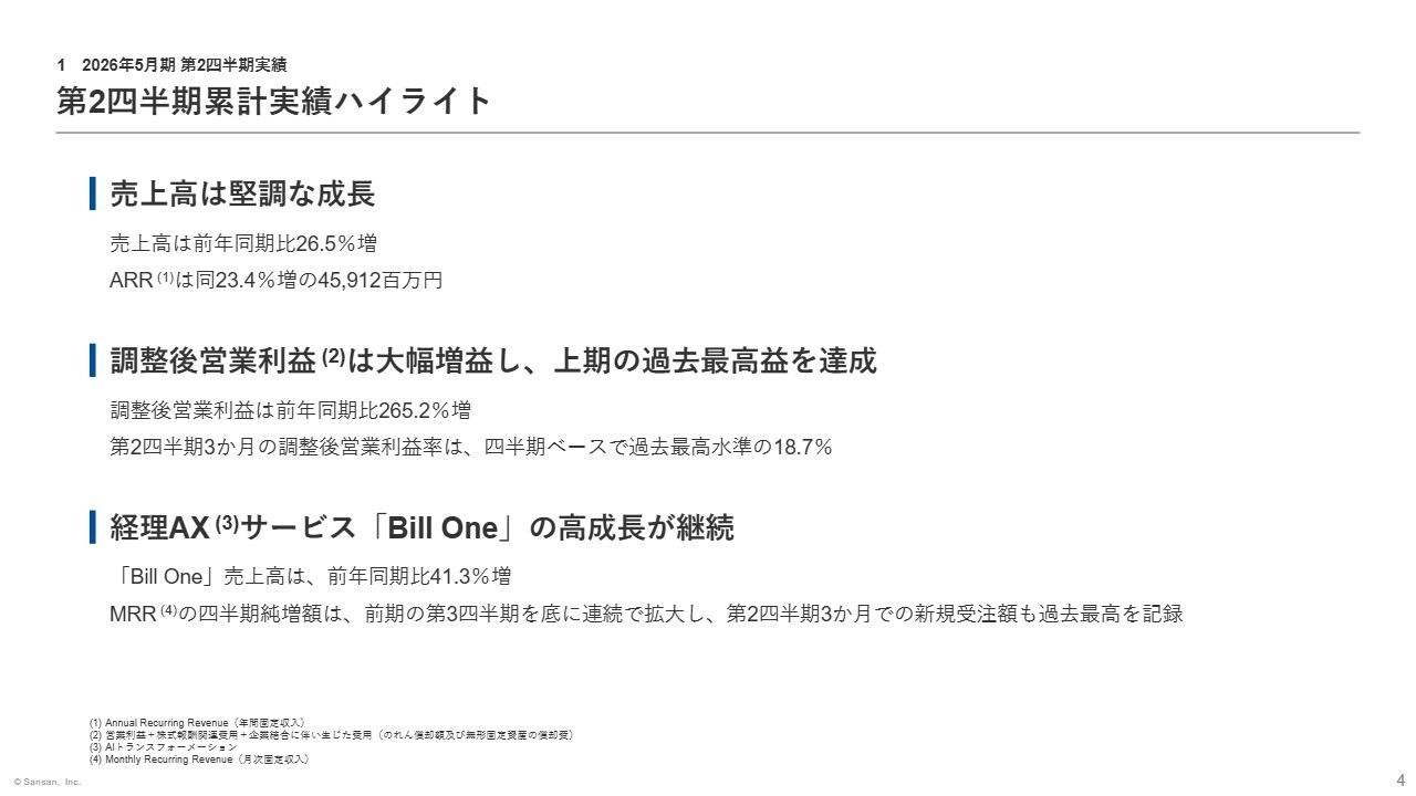 ここからは第2四半期、3ヶ月の実績についてご説明します。売上高は前年同期比25.1パーセント増と堅調に成長しました。売上総利益率は、主に「Bill One」のデータ化オペレーション効率の向上により、前年同期比で2.0ポイント改善しています。調整後営業利益は、売上拡大や売上総利益率の改善に加え、販管費率の低下により、前年同期比294.0パーセントの大幅な増益となっています。