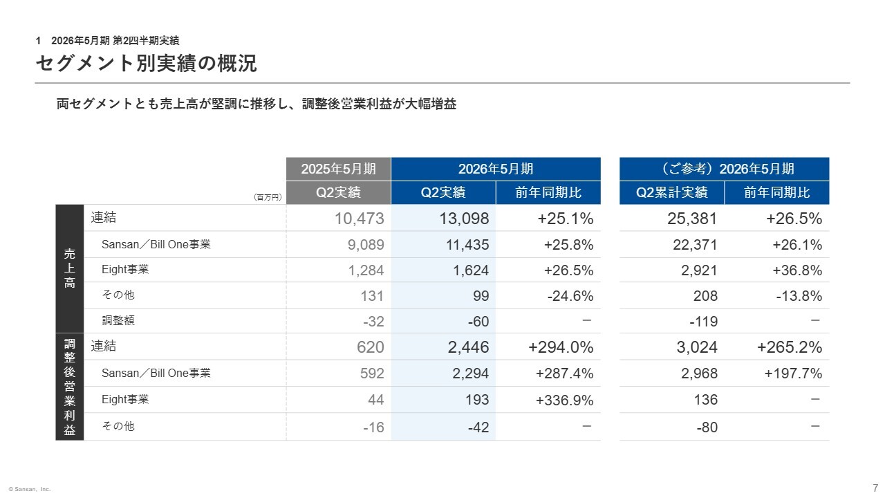 セグメント別の概況です。Sansan/Bill One事業、Eight事業のいずれも売上高が堅調に伸び、調整後営業利益は大幅に増加しました。