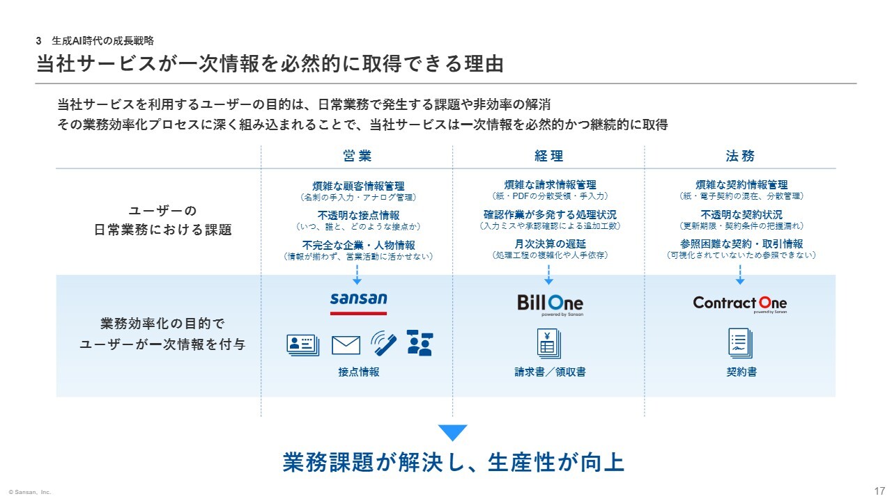 寺田:リードの獲得とAIの関連性という点では、特に大きなインパクトがあるようには感じていません。ただ、業務でAIそのものを使えるかたちで提案していく、先ほどお話しした内容とも重なりますが、データベースとしての「Sansan」や「Bill One」「Contract One」といった要素も重要です。そのため、データ化とデータベースがあって、AIを組み合わせることで業務を効率化していく、例えば「Bill One」の場合、業務を「なくす」というキーワードにしていますが、そのコンセプトは高く受け入れられていると感じています。