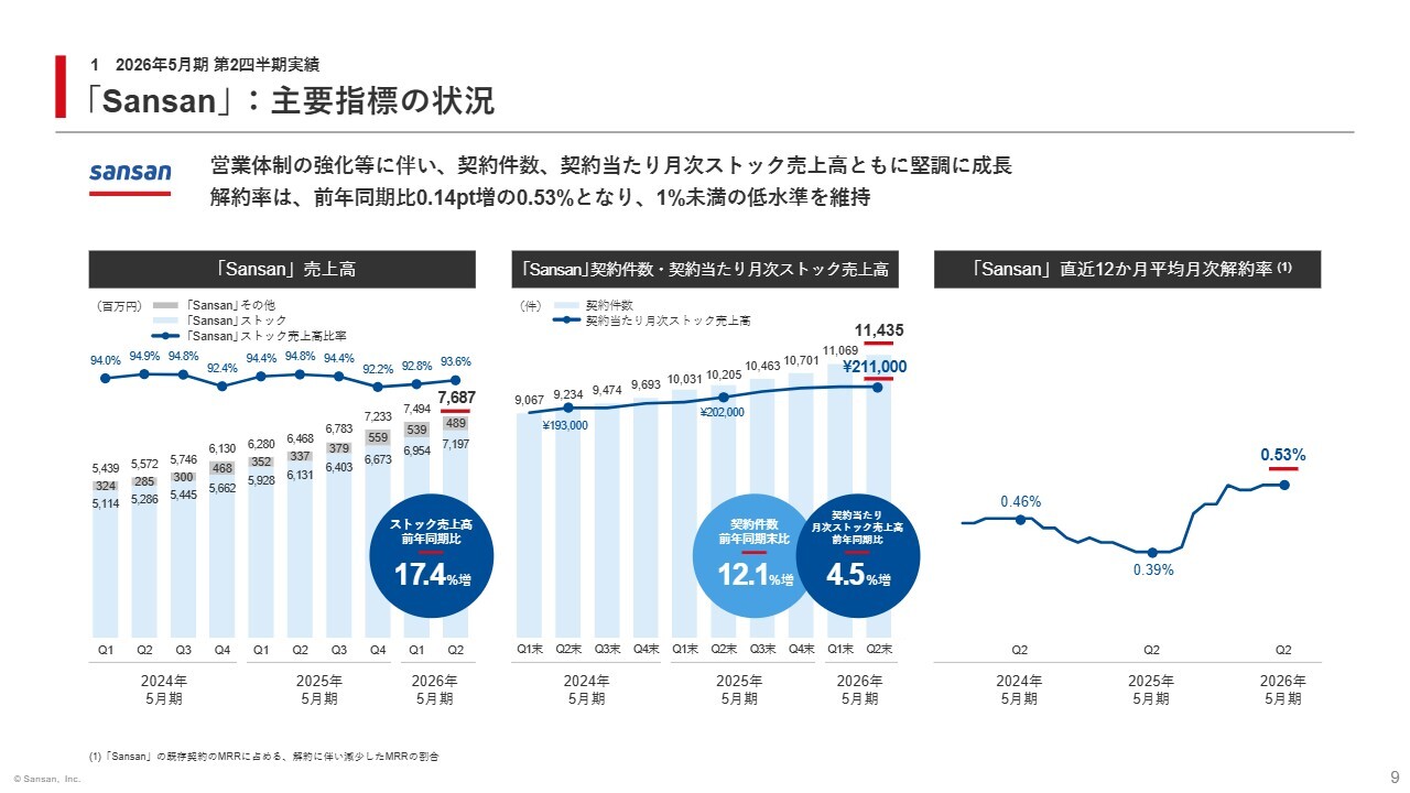 「Sansan」のKPIについてご説明します。スライド左側のストック売上高は前年同期比17.4パーセント増と堅調な結果となりました。