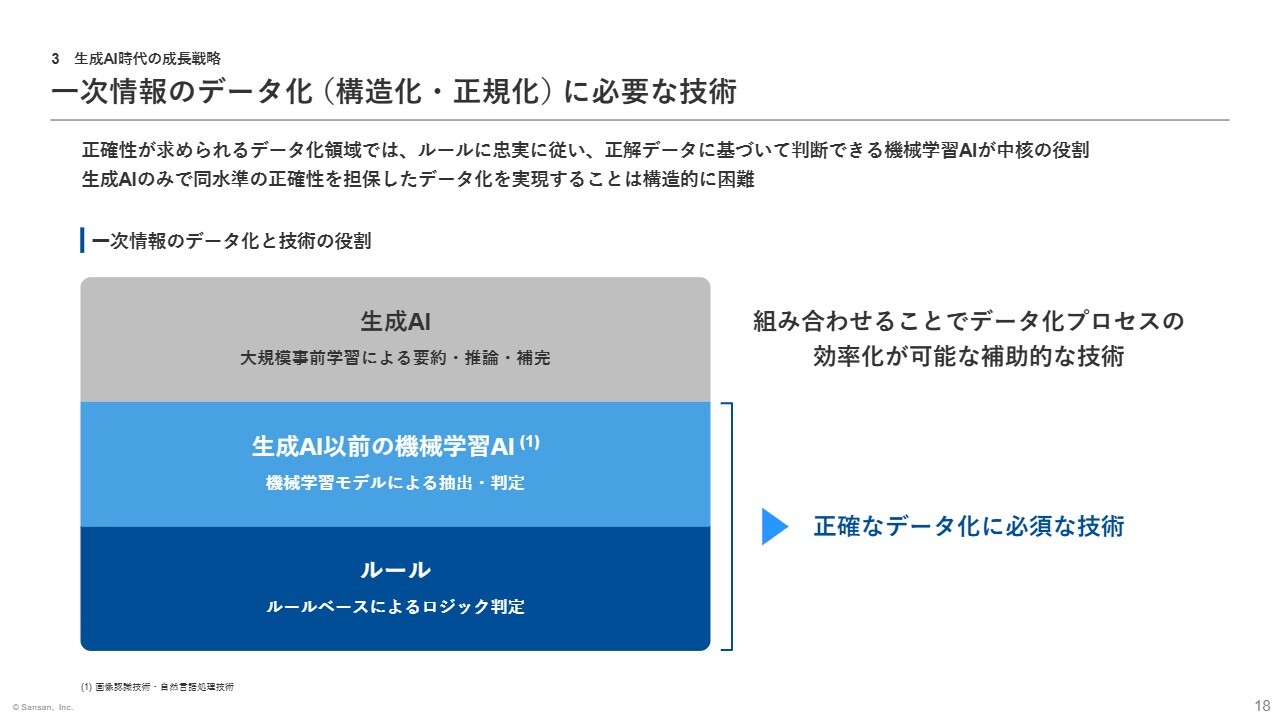 一次情報のデータ化や構造化・正規化は、その後の工程におけるあらゆるシステムや生成AIが大きな価値を発揮するための大前提となります。この一次情報の取得・データ化・活用は、生成AI時代における当社の強固な競争優位性であり、成長基盤として今後さらに強化していきたいと考えています。