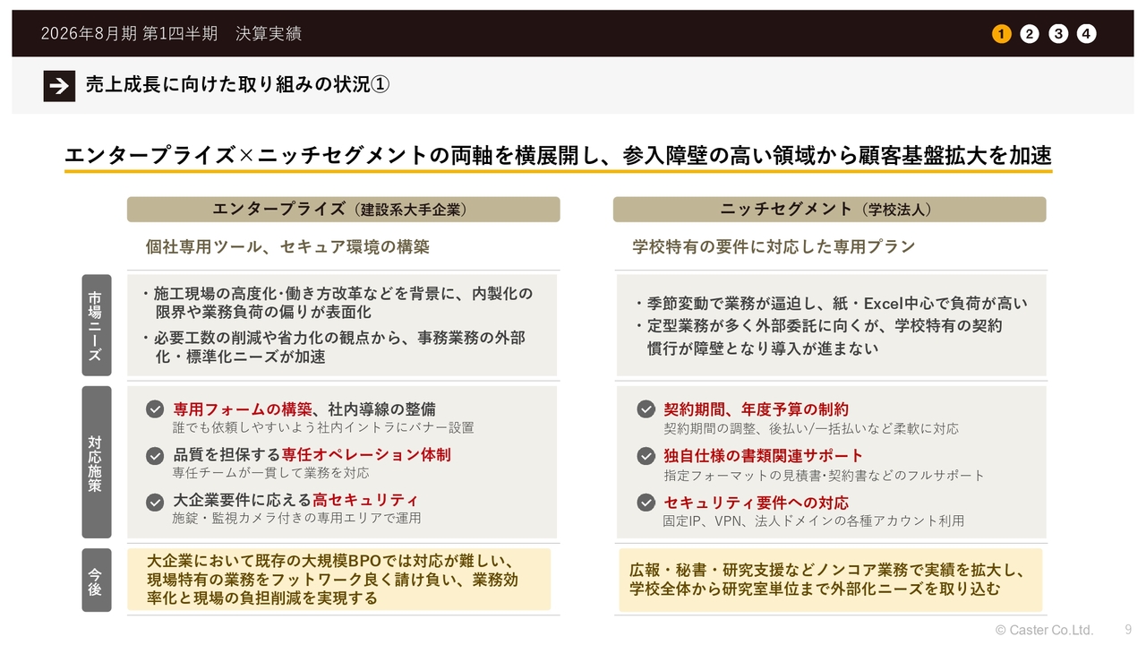 今後の売上成長に向けた取り組みの状況について、一部ご紹介します。エンタープライズと呼ばれる顧客層に関しては、新規のお客さまと既存のお客さまの両方に一定程度含まれています。