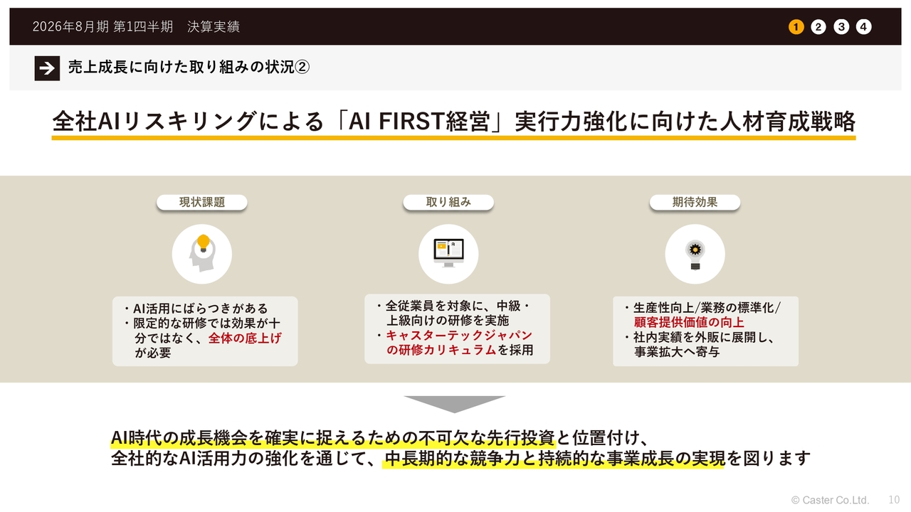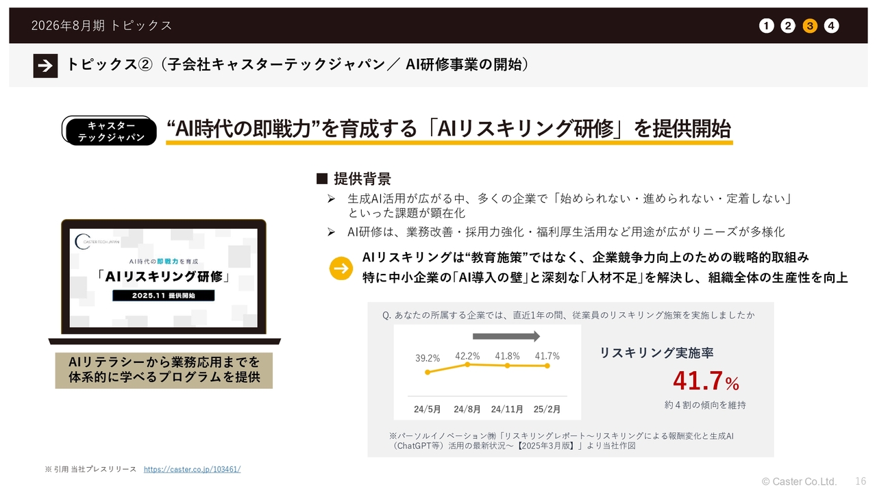 キャスターテックジャパンという子会社で、AI研修事業を開始しました。これは、当社が取り組んでいるAIリスキリング研修と同じ内容です。このようなニーズを世間からいただいているため、子会社でしっかりとサービスとして展開していきたいと考え、事業をスタートしました。