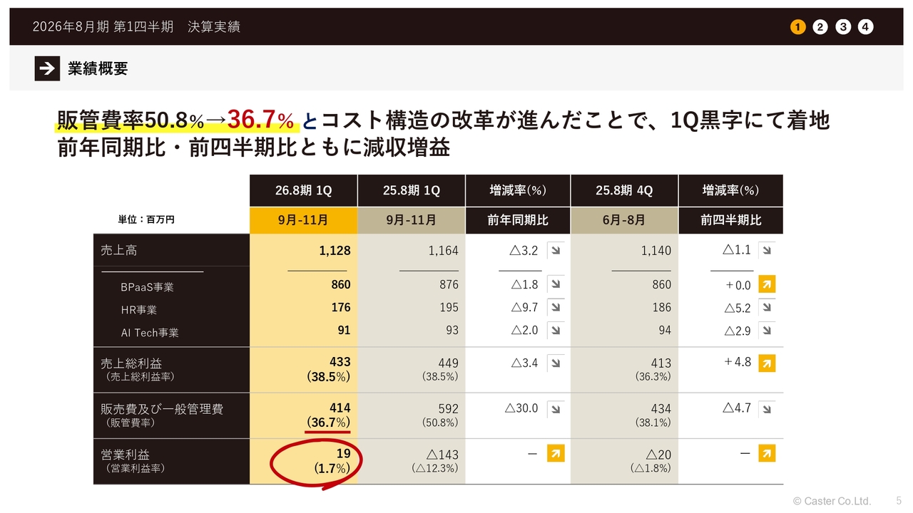黒字化の理由としては、販管費が50.8パーセントから36.7パーセントに改善されたことが挙げられます。コスト構造の変革が着実に進んでいることが反映された結果です。第1四半期は黒字を達成し、前年同期比および前四半期比で減収ながらも増益という結果になっています。