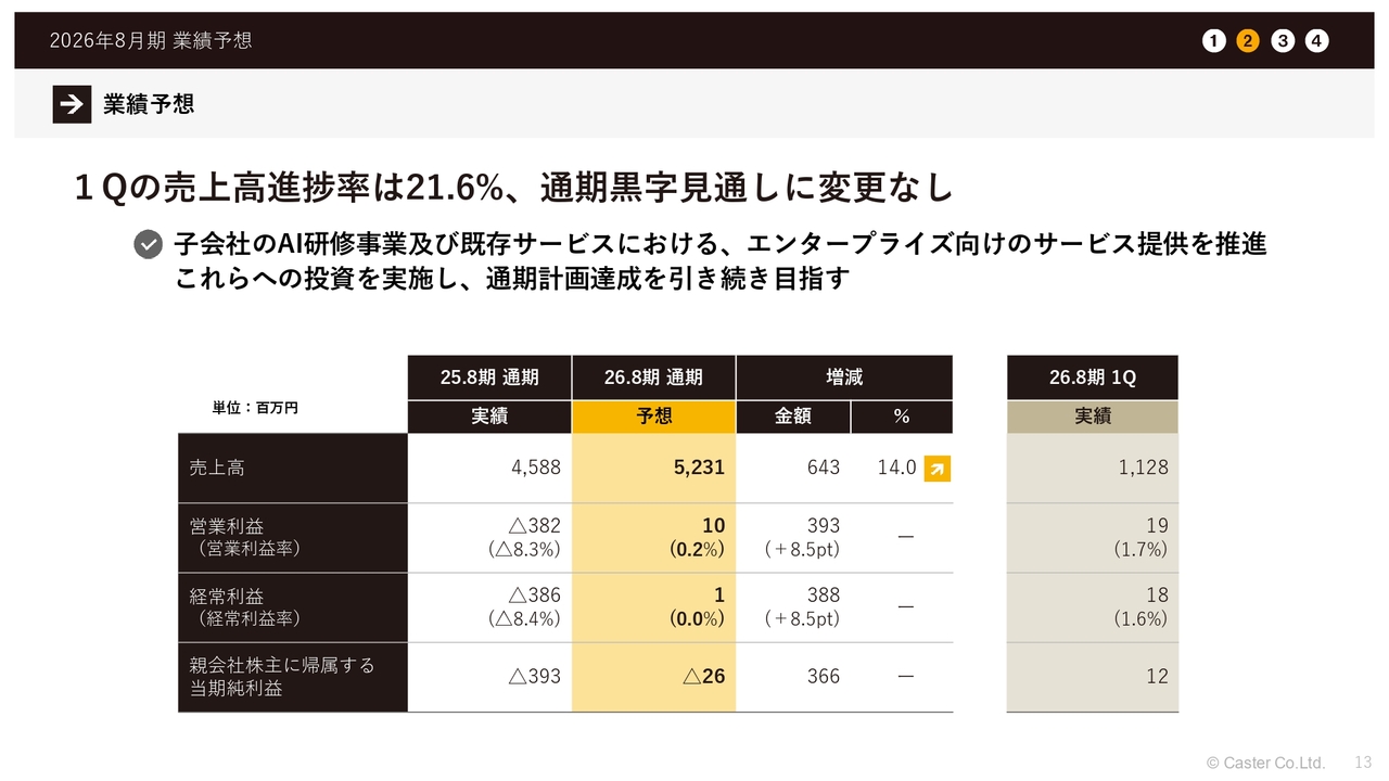 2026年8月期の業績予想についてです。第1四半期の売上高進捗率は21.6パーセントとなっています。通期黒字化の見通しについては、現時点で変更はありません。