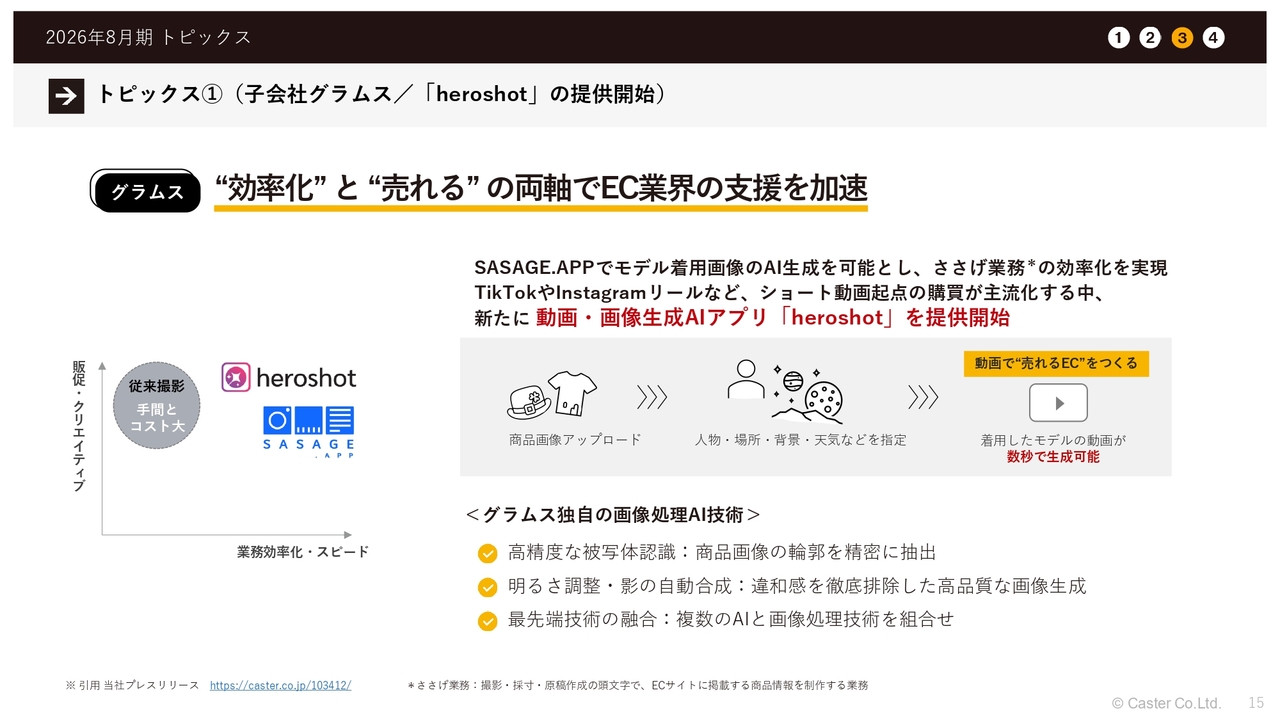 子会社であるグラムスにおいて、「heroshot」というAIサービスの提供を開始しました。もともと同社が提供しているサービス「SASAGE. APP」では、古着等の撮影や採寸を基本的な仕組みとして提供しています。今回新たに、撮影した画像をAIが生成したモデルに着用させる機能を組み込んだサービスをリリースし、これを「SASAGE. APP」にも取り込んでいます。