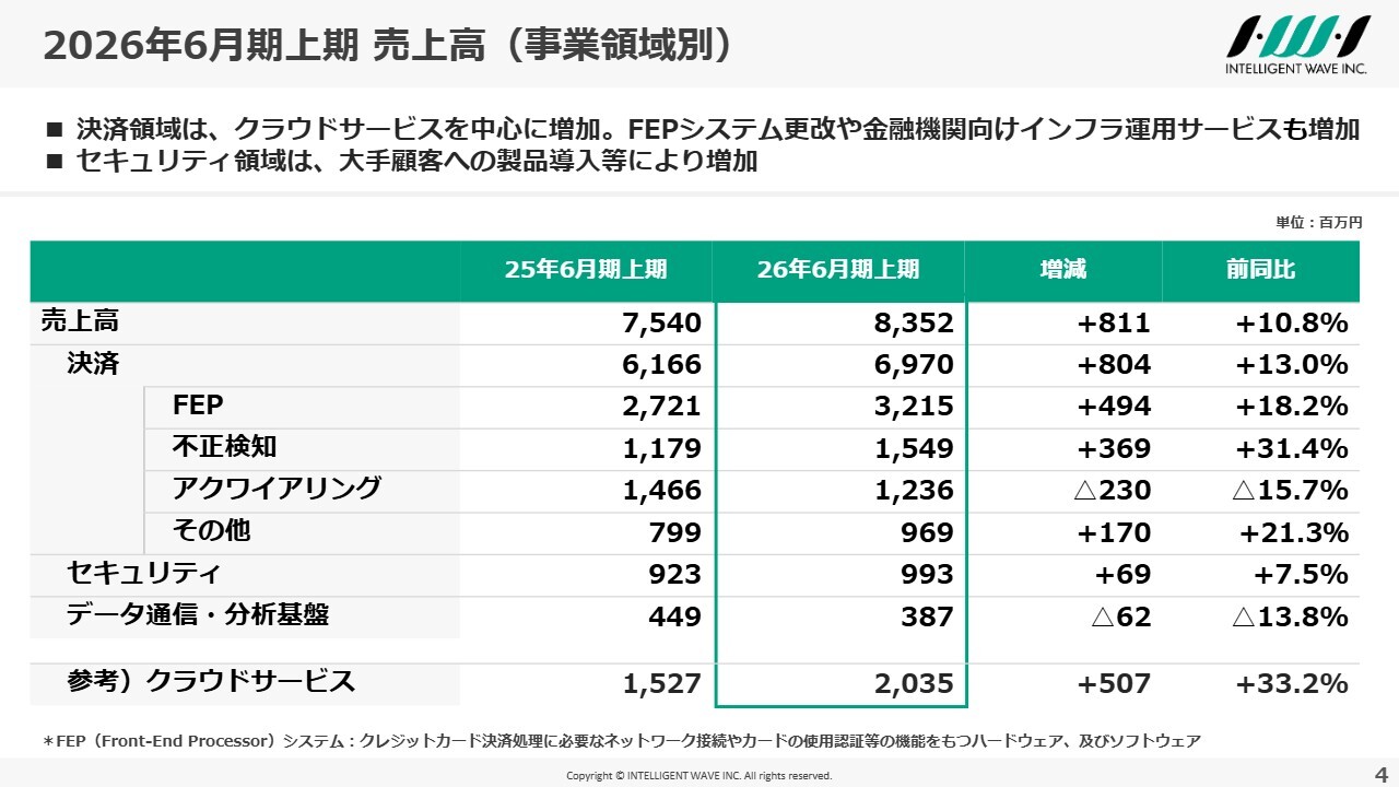 事業領域別の売上状況です。決済領域では、クラウドサービスを中心に増加しました。