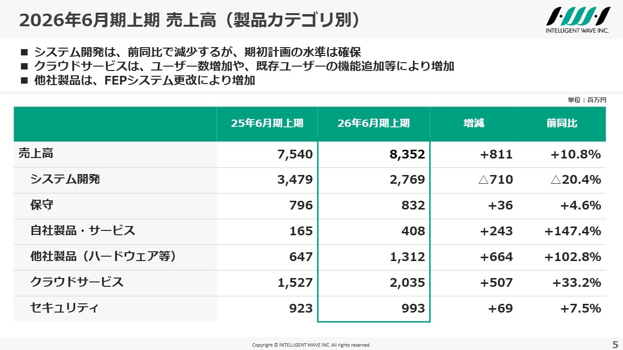製品カテゴリ別の売上状況です。システム開発は、数年来の大型案件が終息に向かっていることもあり、前年同期比では減少していますが、この減少を織り込んだ計画の水準は確保しています。