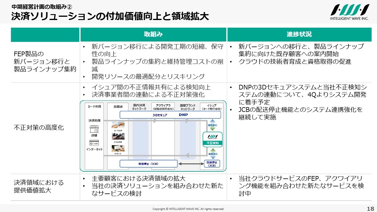 2点目は「決済ソリューションの付加価値向上と領域拡大」です。決済ソリューションの提供価値拡大およびFEPや不正検知分野以外への領域拡大に、まだ課題があると考えています。
