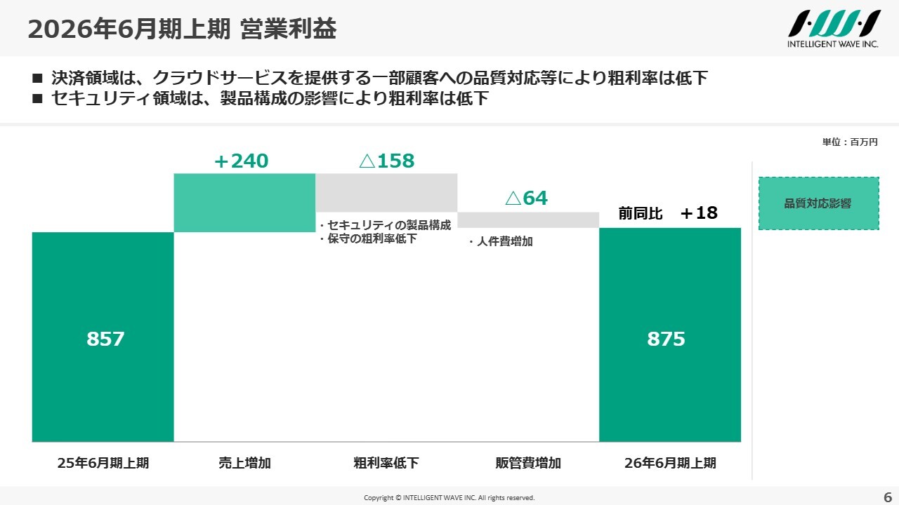 営業利益についてです。前回の決算説明会でもお伝えしたように、クラウドサービスを提供する一部顧客への品質対応の影響により、保守を含めた決済領域全体の売上総利益率が低下し、1,800万円の増加にとどまりました。