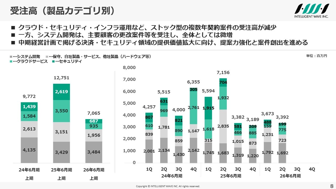 一方で、システム開発の受注については、大手カード会社向けの更改案件を複数確保し、全体では34億8,400万円と、前年同期比で微増となりました。先ほど触れた品質対応の影響により一部で機会損失が発生した面もありますが、コンディションを整え、引き続き提案力を強化し、案件の創出に努めていきたいと考えています。