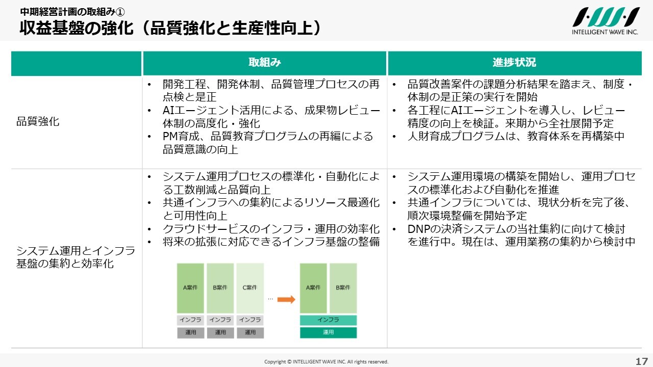 品質強化に関しては、今回の品質問題を受け、個別案件にとどまらず、会社全体で課題を分析し、制度や体制の是正策を策定し、実行に移しています。また、AIなどを活用したレビュー精度の向上や、社員教育プログラムの再構築にも取り組んでいます。