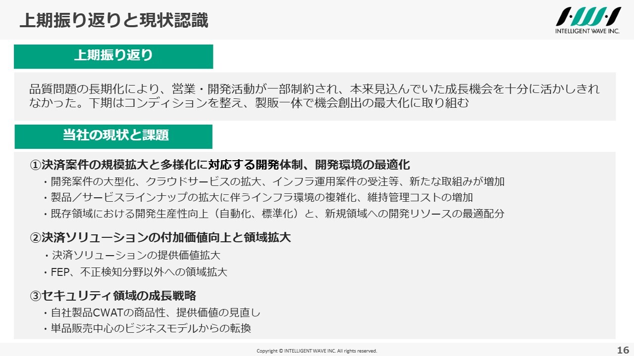 まず、上期を振り返ると、増収増益を確保したものの、品質問題の影響がなければ、収益機会や受注機会をさらに伸ばせたと考えています。下期については、営業や開発のコンディションを整え、機会創出の最大化に努めていきたいと考えています。
