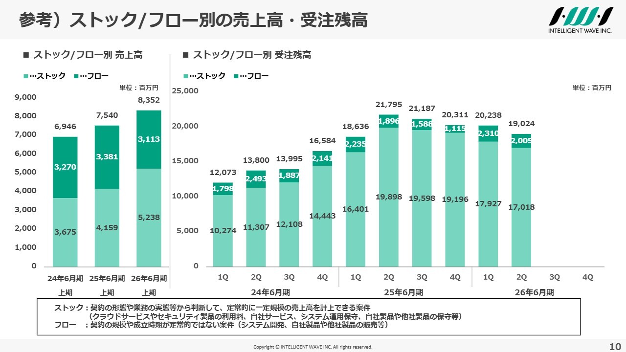 参考までに、ストック・フロー別の受注残高の推移となります。受注残高は複数年契約案件の受注の影響で全体では減少していますが、フロー型の受注残高については、品質問題を抱えながらも、タイミングを見計らいながら受注活動を推進した結果、2025年6月期第2四半期と比較して増加しています。