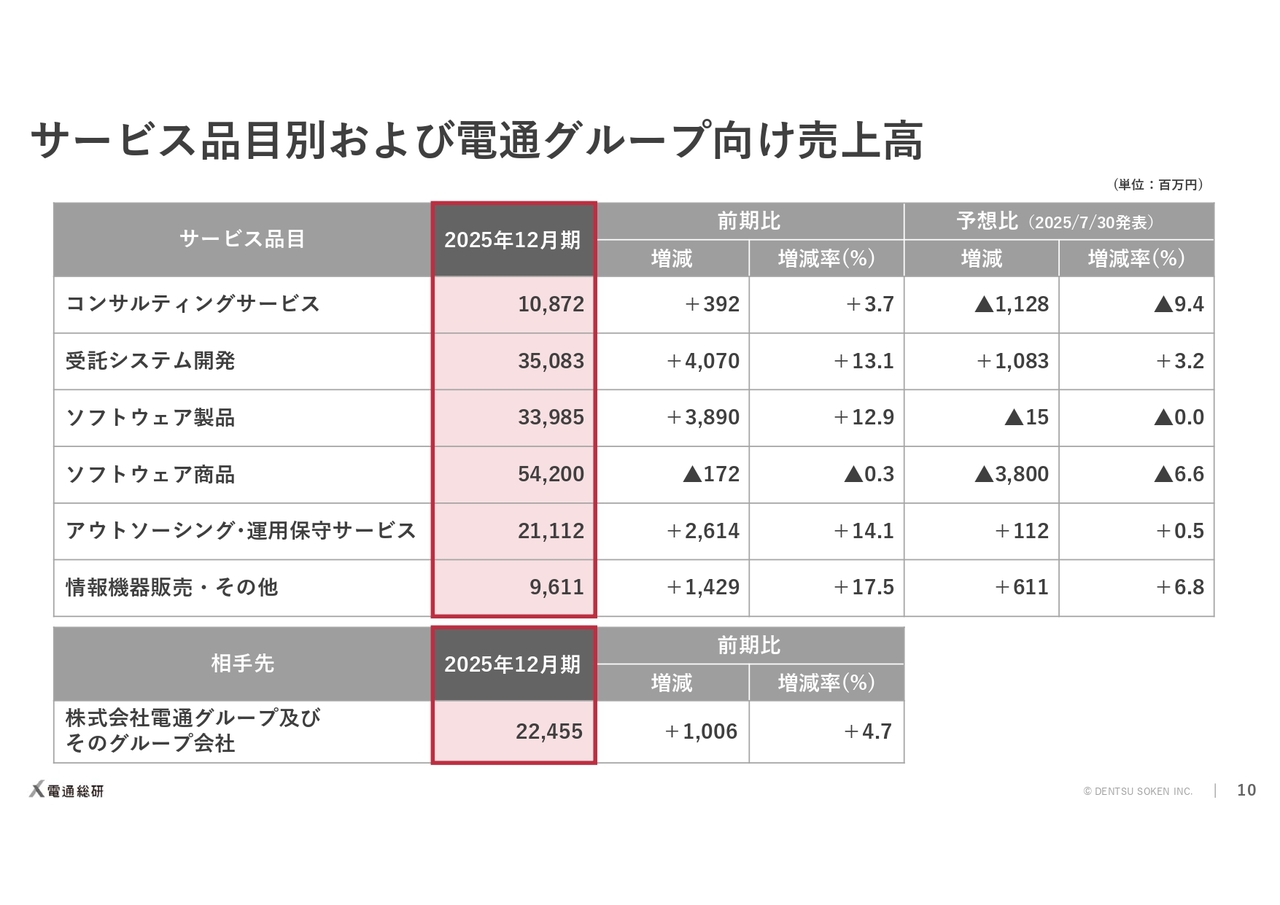 右側がサービス品⽬別です。第3四半期に続き、受託システム開発とソフトウェア製品で、売上が⼤きく拡⼤しています。
