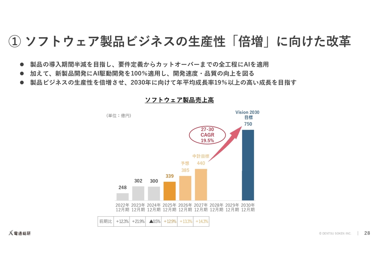 2030年のソフトウェア製品の売上⽬標はこれまで設定していませんでしたが、全体3,000億円のうち750億円を、ソフトウェア製品ビジネスで確⽴したいと考えています。