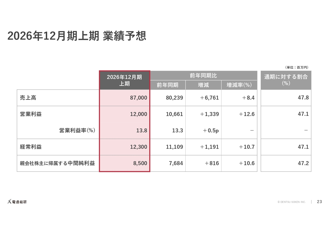 通期に対する割合は、売上⾼47.8パーセント、営業利益47.1パーセントの設定です。製造ソリューションが上期は弱く推移することを考慮し、例年よりやや保守的な進捗率としています。