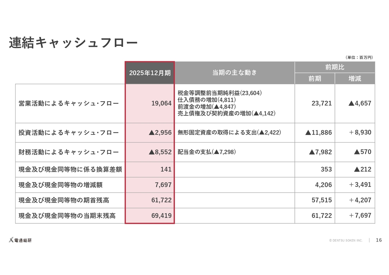 キャッシュフローはご覧のとおりです。前期から76億円キャッシュを増やし、期末残⾼は694億円となりました。