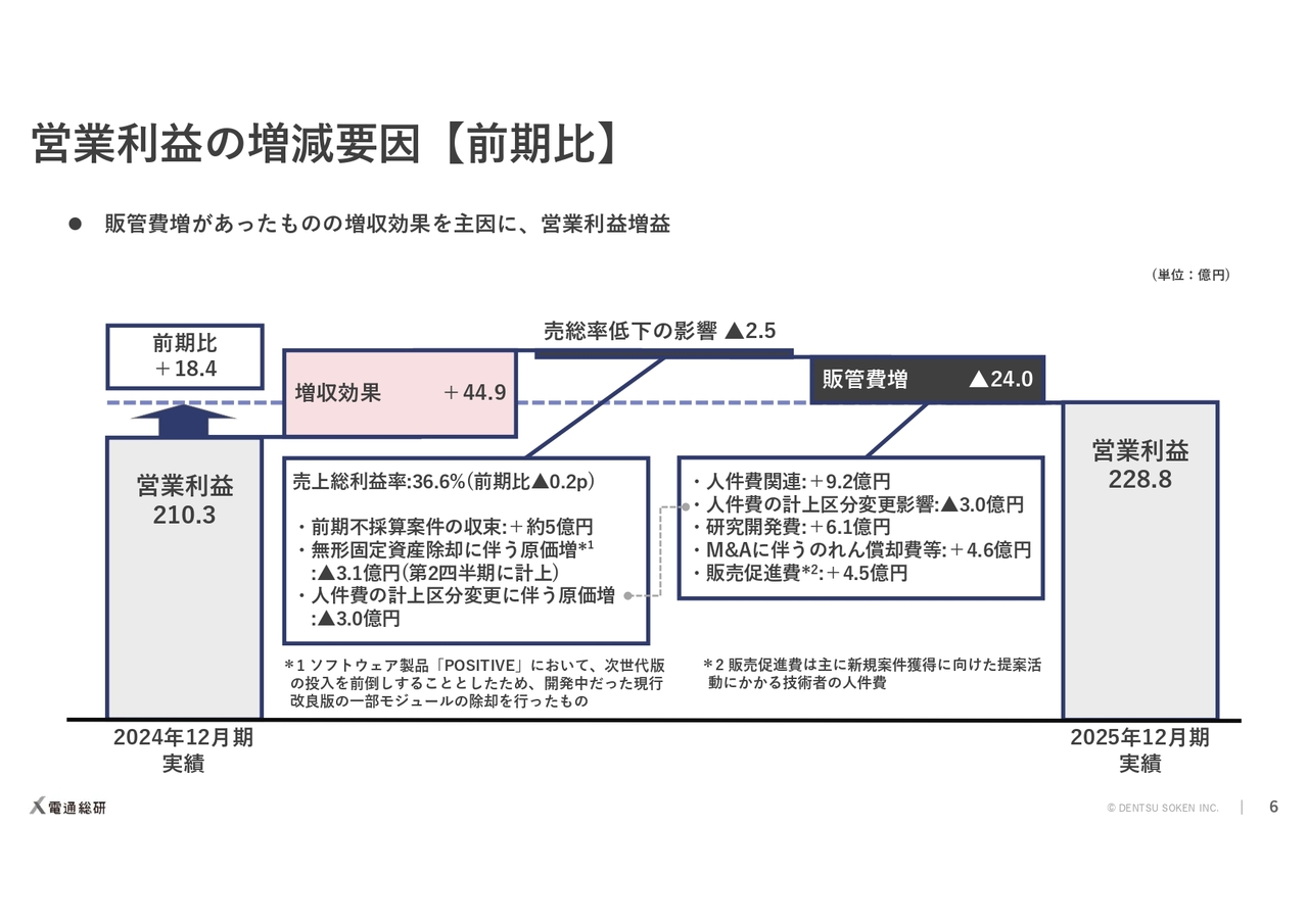 売総率は36.6パーセントと、前期⽐で0.2ポイント低下しました。不採算案件の収束があったものの、ソフトウェア製品「POSITIVE」の開発計画⾒直しやミツエーリンクスでの⼈件費の計上区分変更による原価増があり、売総率の低下につながりました。