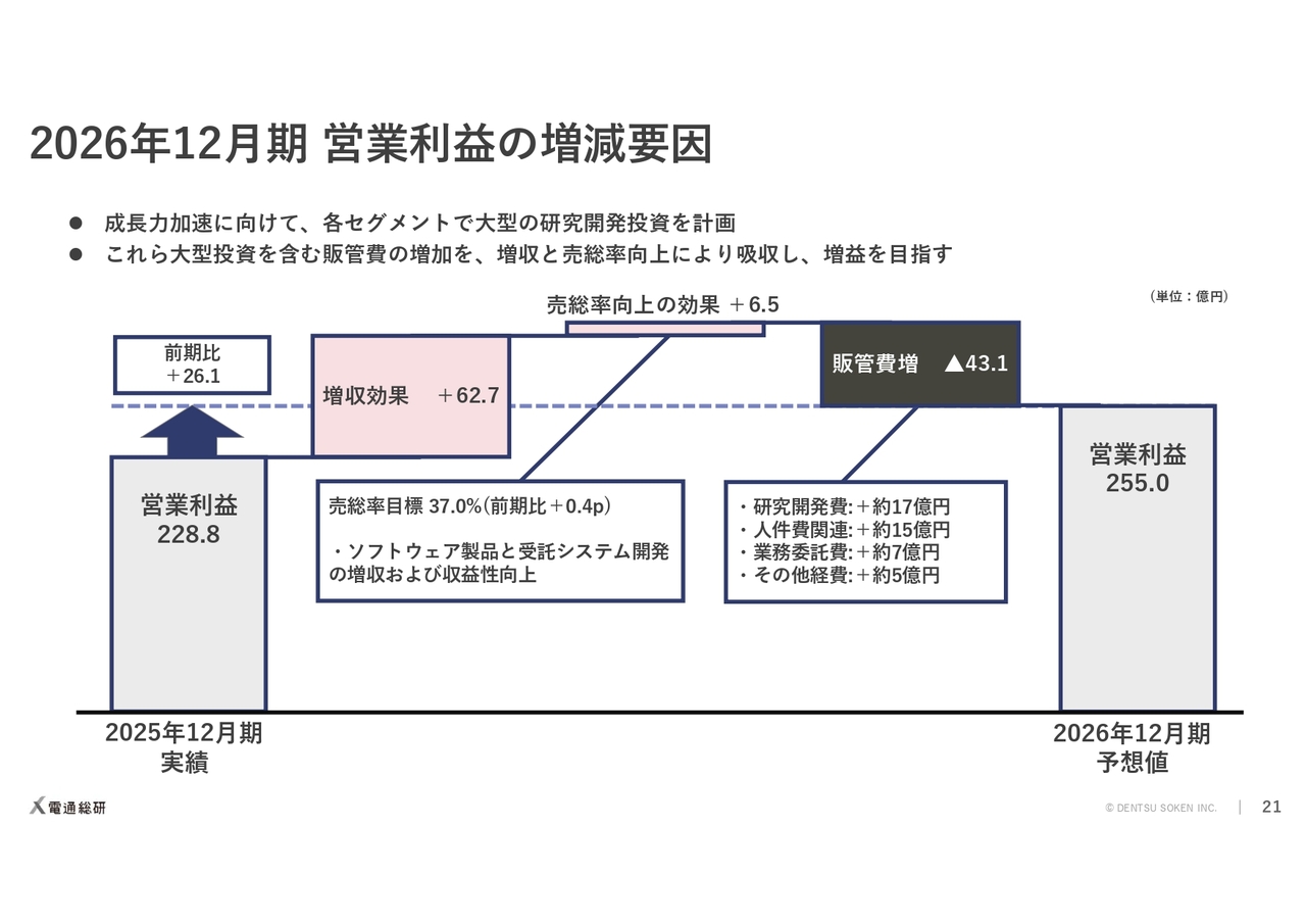 A:受託システム開発およびソフトウェア製品の増収と収益性向上により、前期比で0.4ポイントの改善を見込んでいます。前期から進めているAI駆動開発を当期はさらに推し進めていきますが、当期については、これによる収益性向上を保守的に見積もっています。