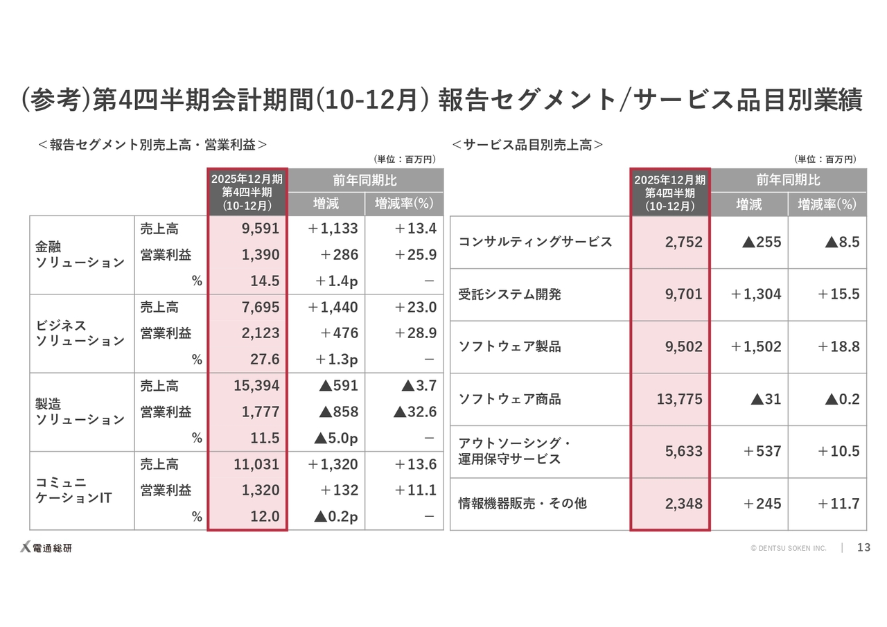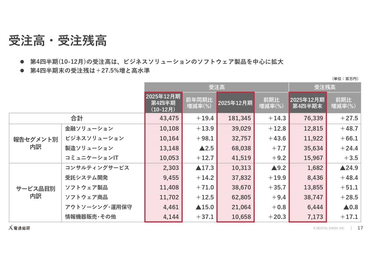 第4四半期末の受注残⾼についても、ビジネスソリューションに加え、⾦融ソリューションと製造ソリューションについても⾼く積み上がり、全体として27.5パーセントの増加となりました。2026年度に向けてかなり良好な状況となっています。