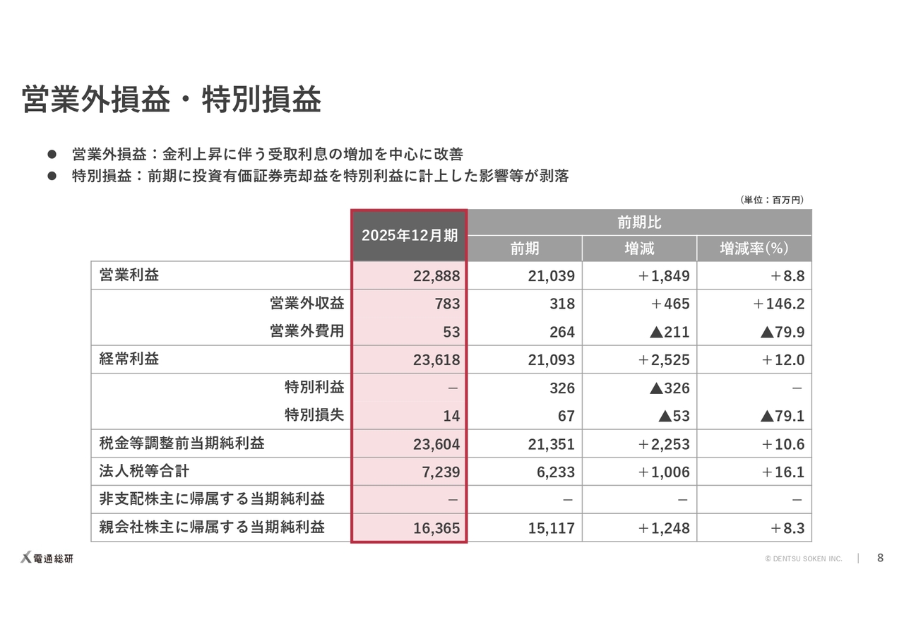営業利益から下の項⽬です。上期に続いて、受取利息を中⼼に営業外損益が改善しています。