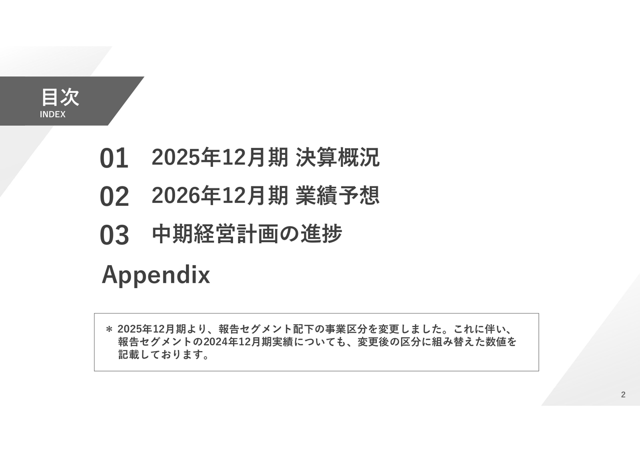 2025年12⽉期の決算および2026年度業績予想について、説明します。