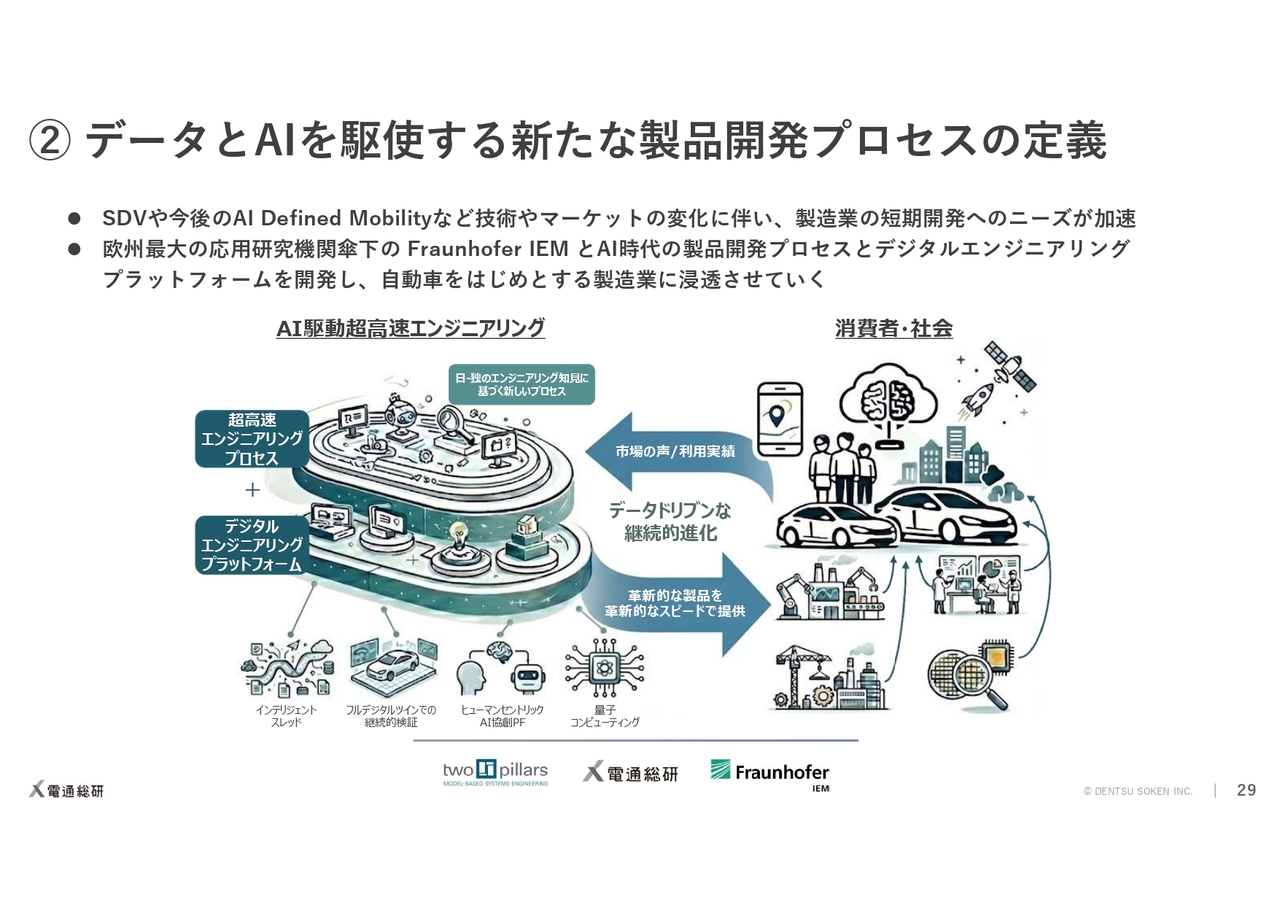 当社は、10年以上前にモデルベース開発をいち早く提唱し、製造業のものづくりにおけるITビジネスをリードしてきました。このアドバンテージをさらに加速させるため、欧州最⼤級の応⽤研究機関傘下のFraunhofer IEMと連携し、AI時代に適した新しい設計・開発のプロセスのモデルと、デジタルプラットフォームを共同で開発します。