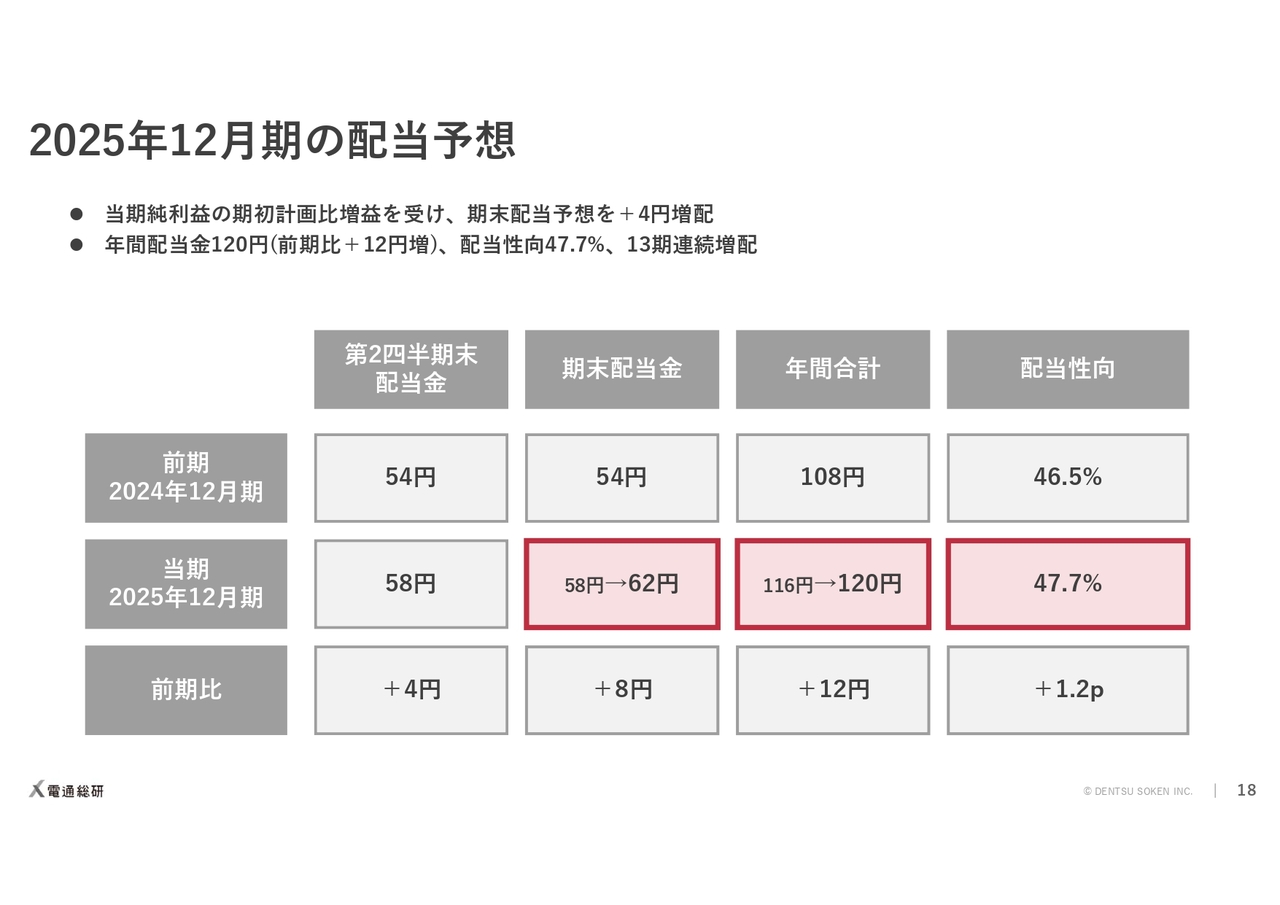 すでに実施済みの中間配当⾦とあわせると、年間配当⾦は前期⽐12円増の1株当たり120円、連結配当性向は47.7パーセントとなり、13期連続の増配となる予定です。