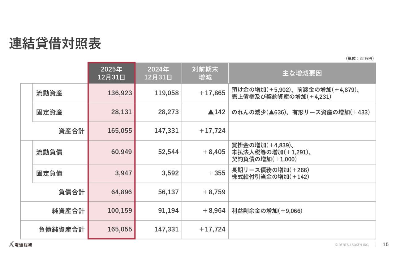 A:主に製造ソリューションセグメントで減少しました。半導体の供給制約等を背景に、輸送機器業を中心に一部の企業が投資抑制を行った影響を受けました。一方で、案件の相談は数多くあり、投資抑制は一時的で、タイミングが2026年12月期にずれ込んでいるものと考えています。エンジニアリング領域のほか、会計やマーケティング、AI活用の領域でも多くの引き合いをいただいています。