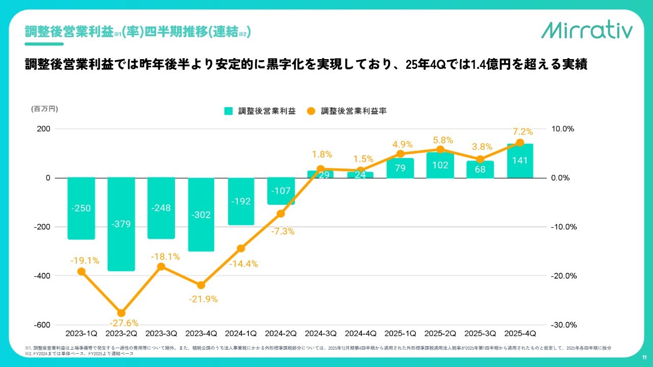 調整後営業利益の推移です。上場費用を控除した推移では、昨年の第4四半期において過去最高の調整後営業利益となっています。この直近の営業利益の改善と積み上げが、今期の11億円を超える営業利益および営業利益率につながっており、第4四半期単体で見ると営業利益率は7.2パーセントに達しました。