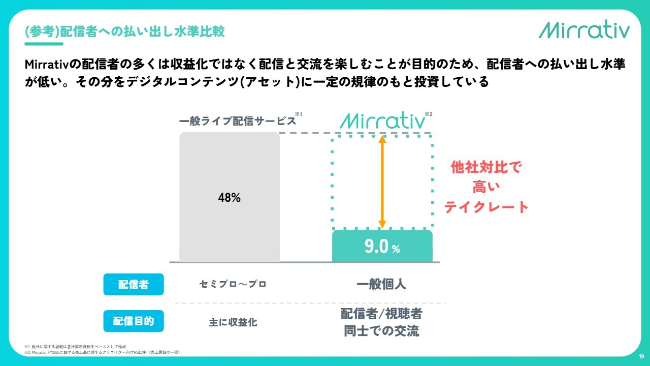 結果として、当社が配信者さまに還元する額は現状9.0パーセントとして現状の成長を実現しています。一般的な配信者還元率と比較して約40パーセントの差分が生まれています。ライブ配信という形式を採用していますが、事業モデルとしては大きく異なるものと当社は考えています。