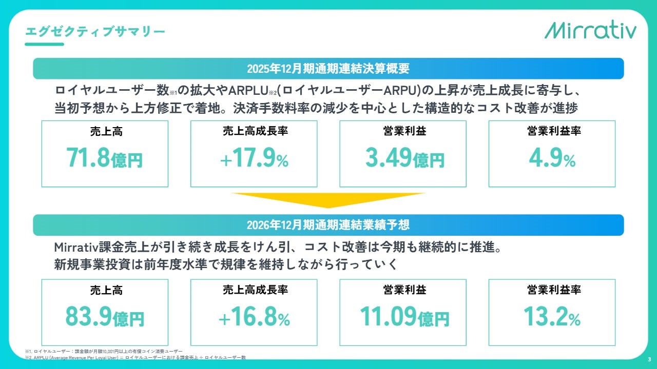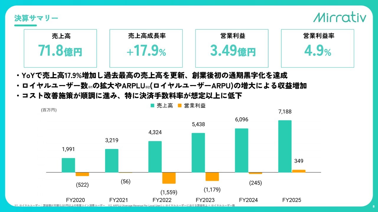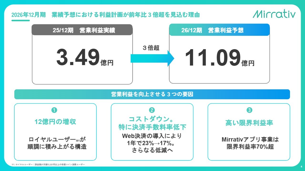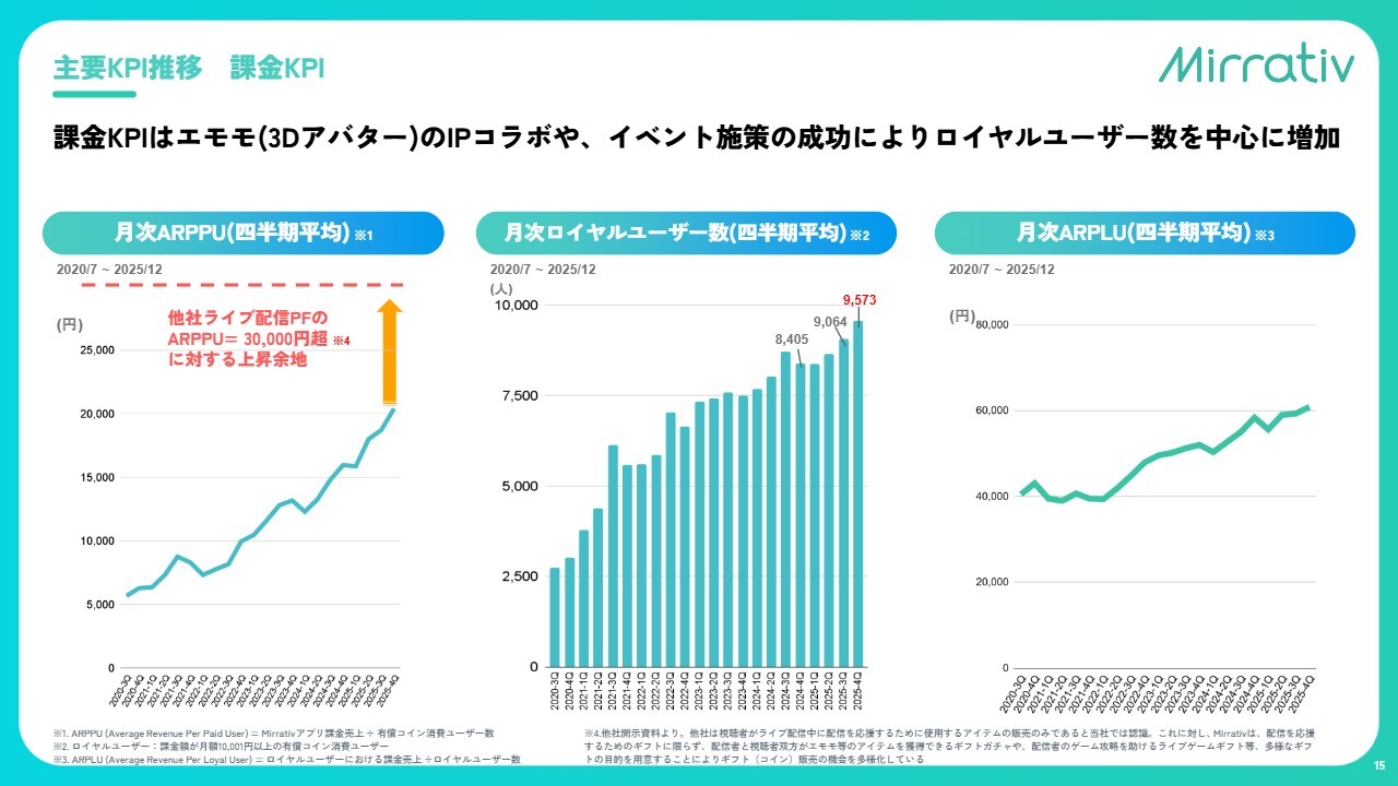過去から順調に成長を続けており、2024年度の赤字決算から2025年度は営業利益3.49億円の黒字で着地しました。要因としては、ロイヤルユーザー数の拡大、ARPLU(ロイヤルユーザー一人当たり課金額)の上昇、そしてコスト改善が挙げられます。今後も構造的な成長が期待されます。