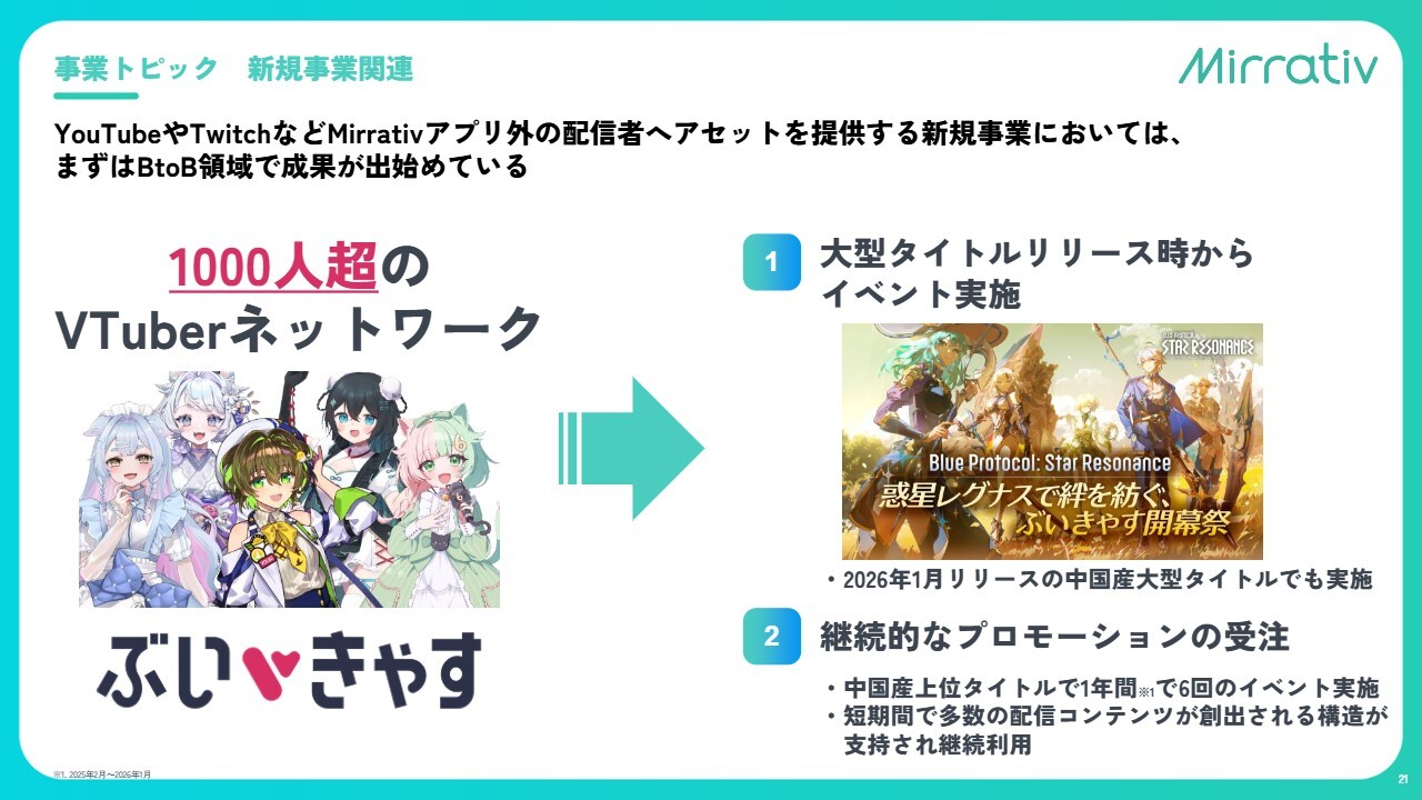 結果的に、『BLUE PROTOCOL』というタイトルや、直近にリリースされた非常に大きな中国産タイトルにおいて「ぶいきゃす」が利用され、売上が着実に立ち上がり始めています。