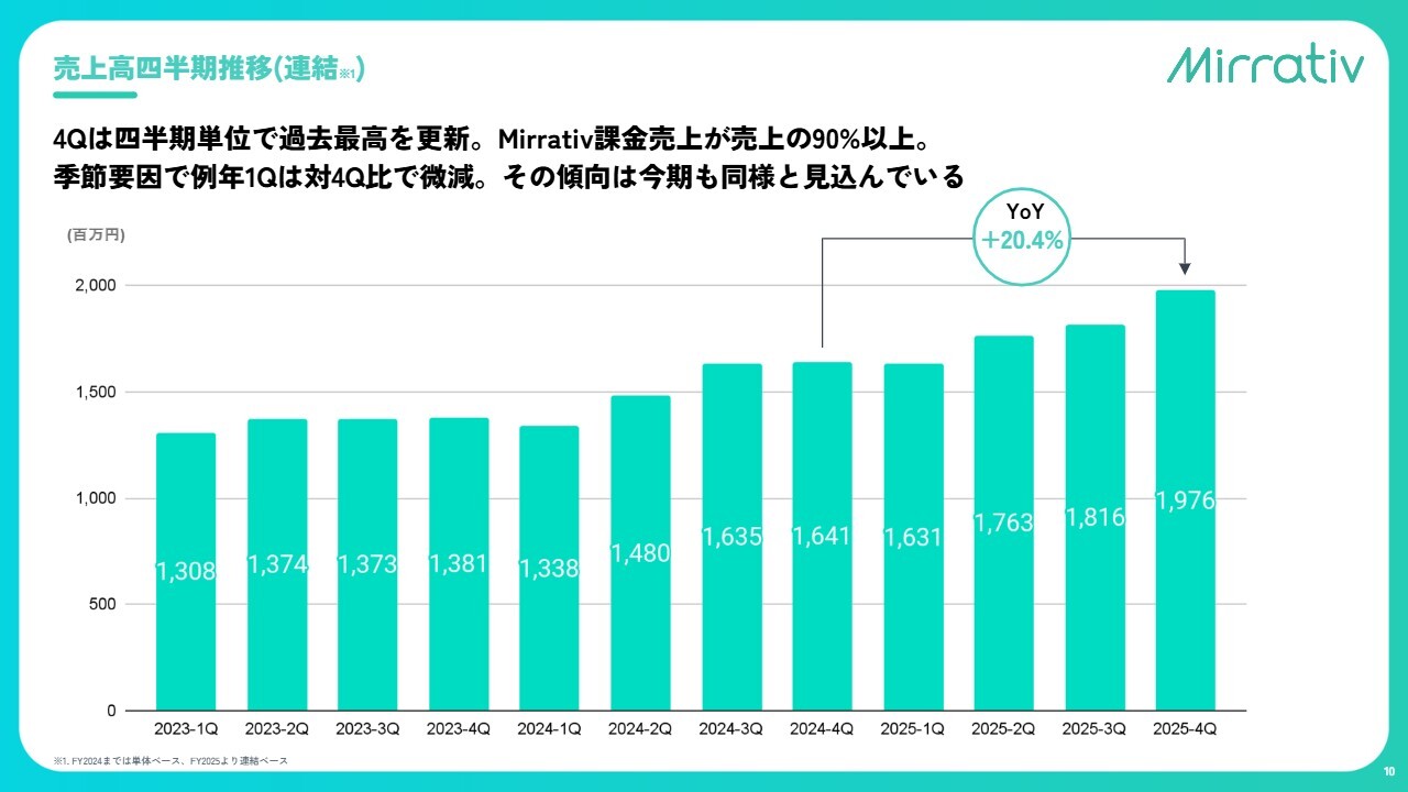 売上については順調に増加しています。年次での成長率は先ほどお伝えしたとおりですが、上方修正の要因となった昨年10月から12月の第4四半期決算では、前年同期比で20.4パーセントの成長を示しました。売上高の約90パーセント以上が「Mirrativ」既存アプリの課金売上となっています。