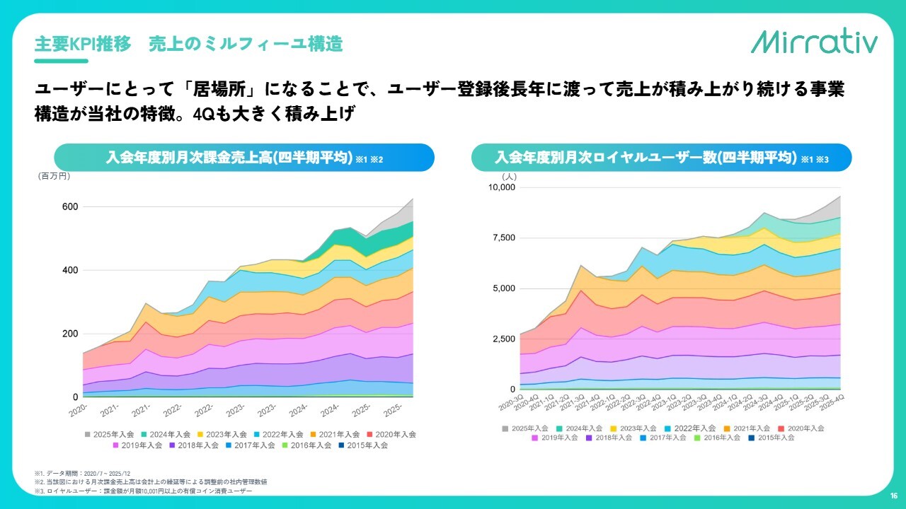 真ん中のグラフは、先ほどキーKPIとしてお伝えしたロイヤルユーザー数の推移です。こちらはミルフィーユ状に積み上がり、第4四半期に過去最高値を更新しました。この傾向は今後も継続を目指しています。