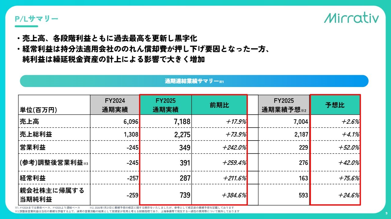 調整後営業利益については、当社は昨年12月に東証グロース市場に上場したことに伴い、上場関連費用を除いた営業利益を記載しています。経常利益に関しては、持分法適用会社ののれん償却費が押し下げ要因となりました。一方で純利益については、繰延税金資産の計上により大幅に増加し、通期実績は7.39億円となりました。