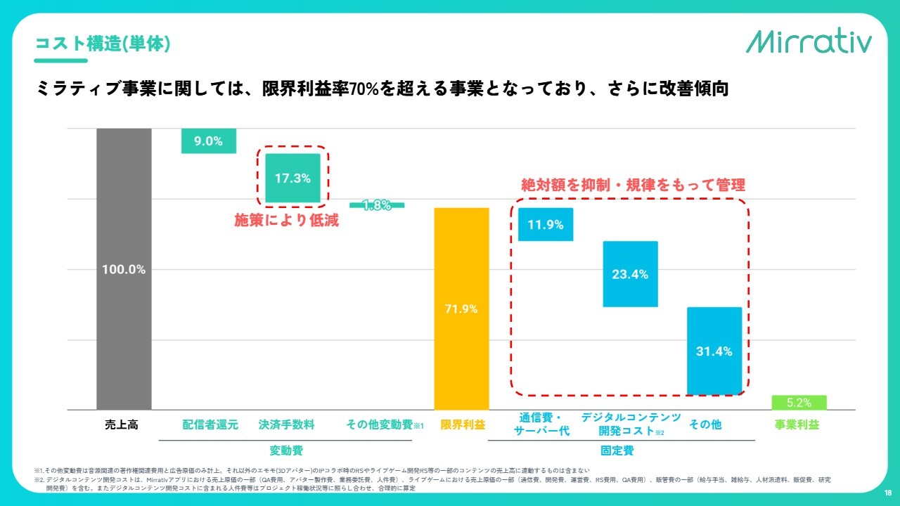 残りは固定費となりますが、通信費やサーバー代は固定費として、1人当たり売上増加に伴い低減傾向にあります。一方で、高い限界利益率を活かし、当社独自のコンテンツやオリジナリティのあるアバターやライブゲームに投資することで、ユーザーさまに長く居場所として使い続けていただくことを担保する事業体制を構築しています。