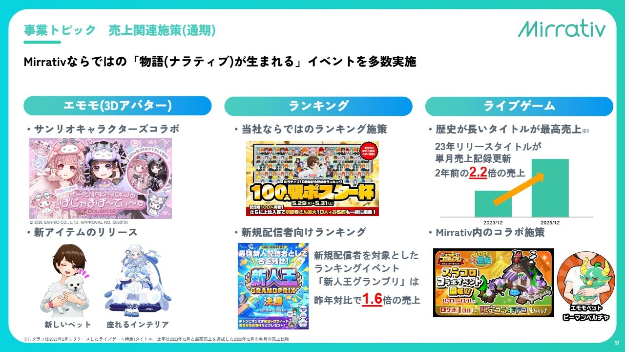 また、昨年持分法適用会社となったキャスコード社では、月間1万4,000人を超える配信者がYouTubeやTwitchで活躍しており、これらの配信者さまにも当社のアセットを提供するかたちで新規事業の展開を進めています。