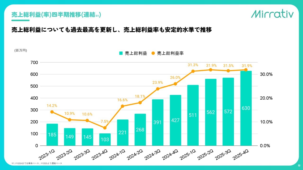 売上総利益と売上総利益率の推移です。売上総利益は過去最高値を更新し、売上総利益率も安定した水準で推移しています。