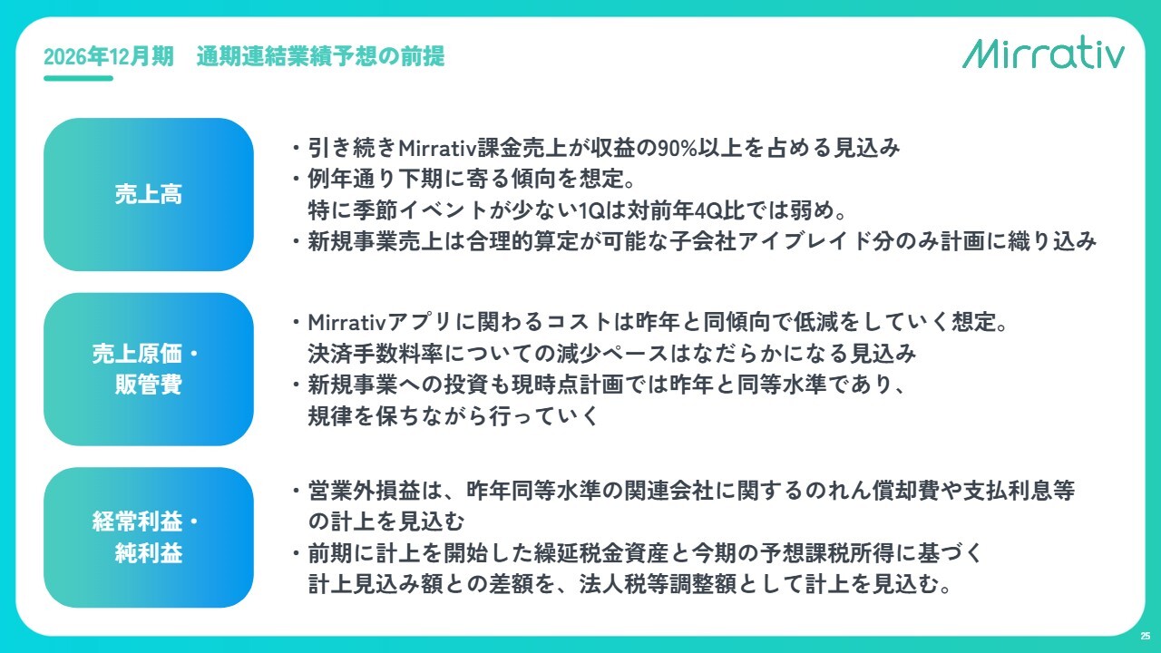 売上高は引き続き「Mirrativ」の課金収益が中心となります。上期(第1四半期、第2四半期)よりも下期(第3四半期、第4四半期)に売上が寄る傾向がこれまでもあり、この傾向は今期も前提としています。特に第1四半期については、第4四半期比で弱めに見込んでいます。
