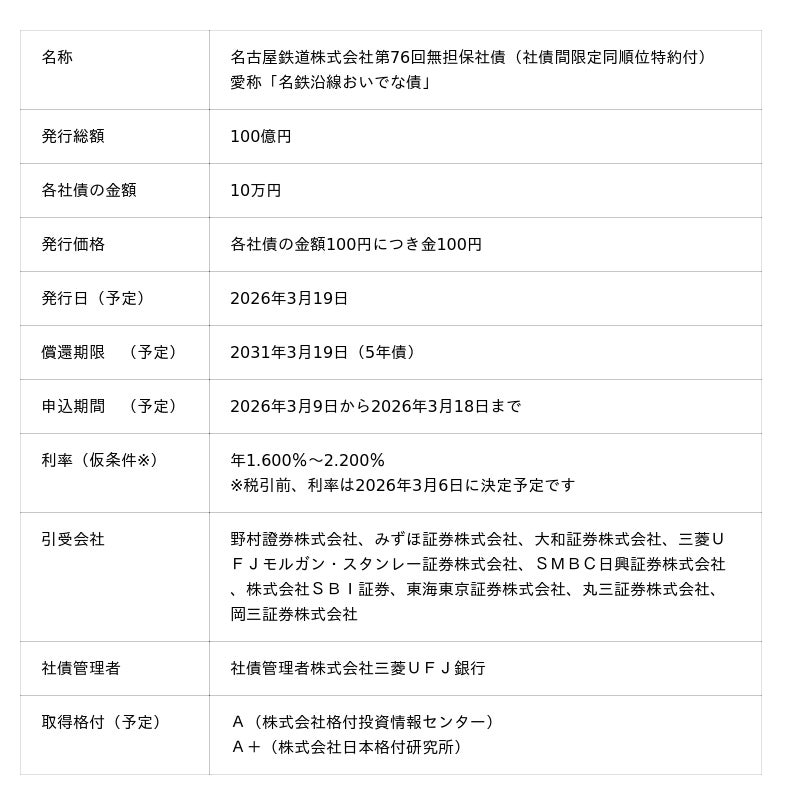 名古屋鉄道は、個人投資家の皆さまに当社グループのサービスや魅力ある沿線地域に興味を持っていただくことを目的に、個人投資家向け無担保社債「名鉄沿線おいでな債」(以下、「本社債」)を発行します。本社債は、より幅広い個人投資家の皆さまにご検討いただけるよう、購入単位を10万円からとし、投資環境の拡充を図ります。