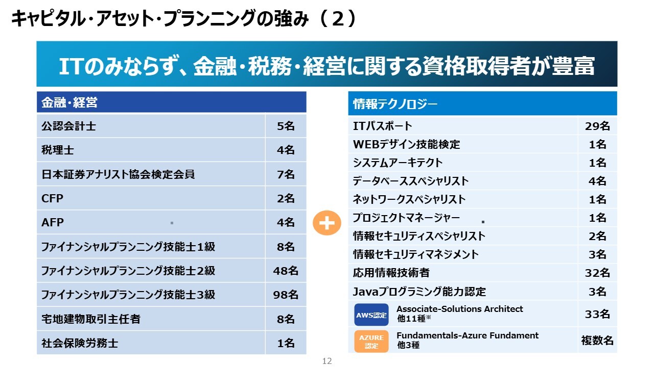 北山:スライドに記載しているとおり、当社にはITだけでなく、金融・税務・経営に関連する資格取得者が豊富に在籍しており、これも当社の大きな強みです。具体的には、公認会計士、税理士、日本証券アナリスト協会検定会員が社内におり、これらの資格を複数保有している社員もいます。このため、タックスマネジメントとアセットマネジメントの両方を深く理解しています。また、プログラマー自身がCFP、AFP、ファイナンシャル・プランニング技能士の資格を保有しているケースも多く、資格取得者が充実しています。