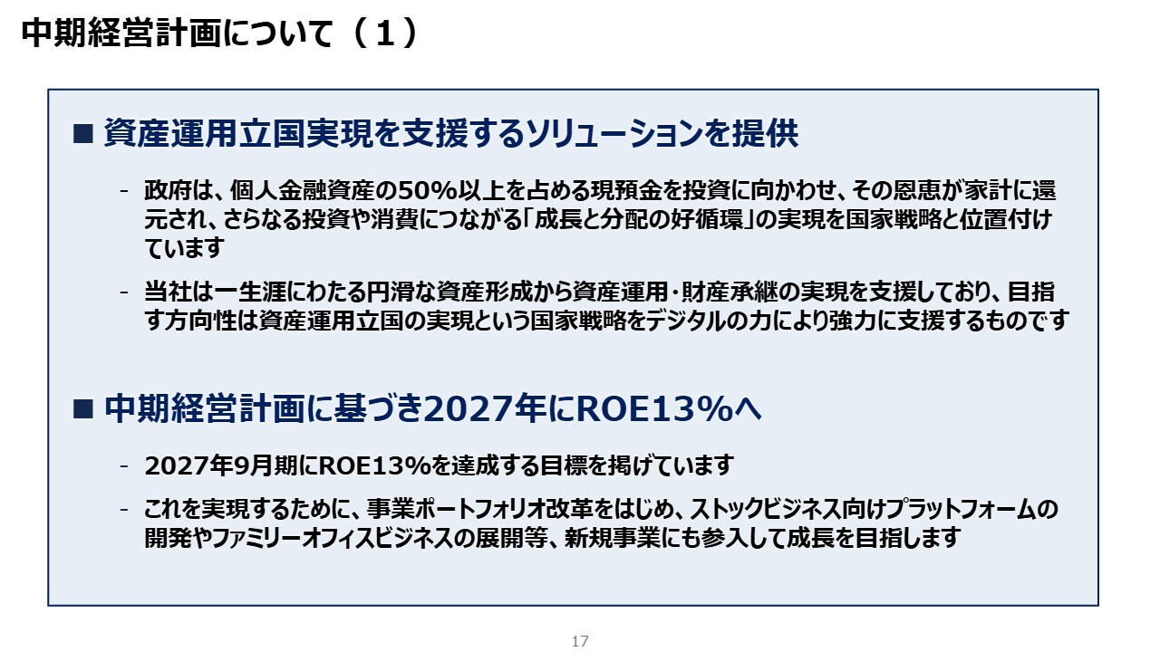 大相続時代を迎え、資産の組み換えが進む時代においては、資産運用が今後の戦略として非常に重要なテーマになると考えています。Finatextさんとは事業内容に違いがあるため、前年比40パーセントの成長ということは難しいかもしれませんが、継続的に10パーセント超の年平均成長率を実現することを目標としており、それは十分可能であると見込んでいます。