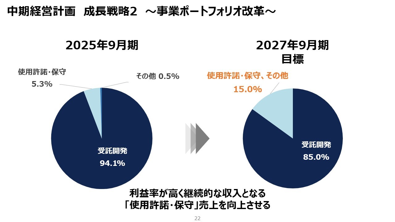 さらに、先ほどご説明したIFA向けのプラットフォームを構築し、受託開発から使用許諾ビジネスに移行を進める方針です。これにより、一時使用許諾料や継続使用料を計上することで売上を拡大し、利益率の向上を目指していく計画です。